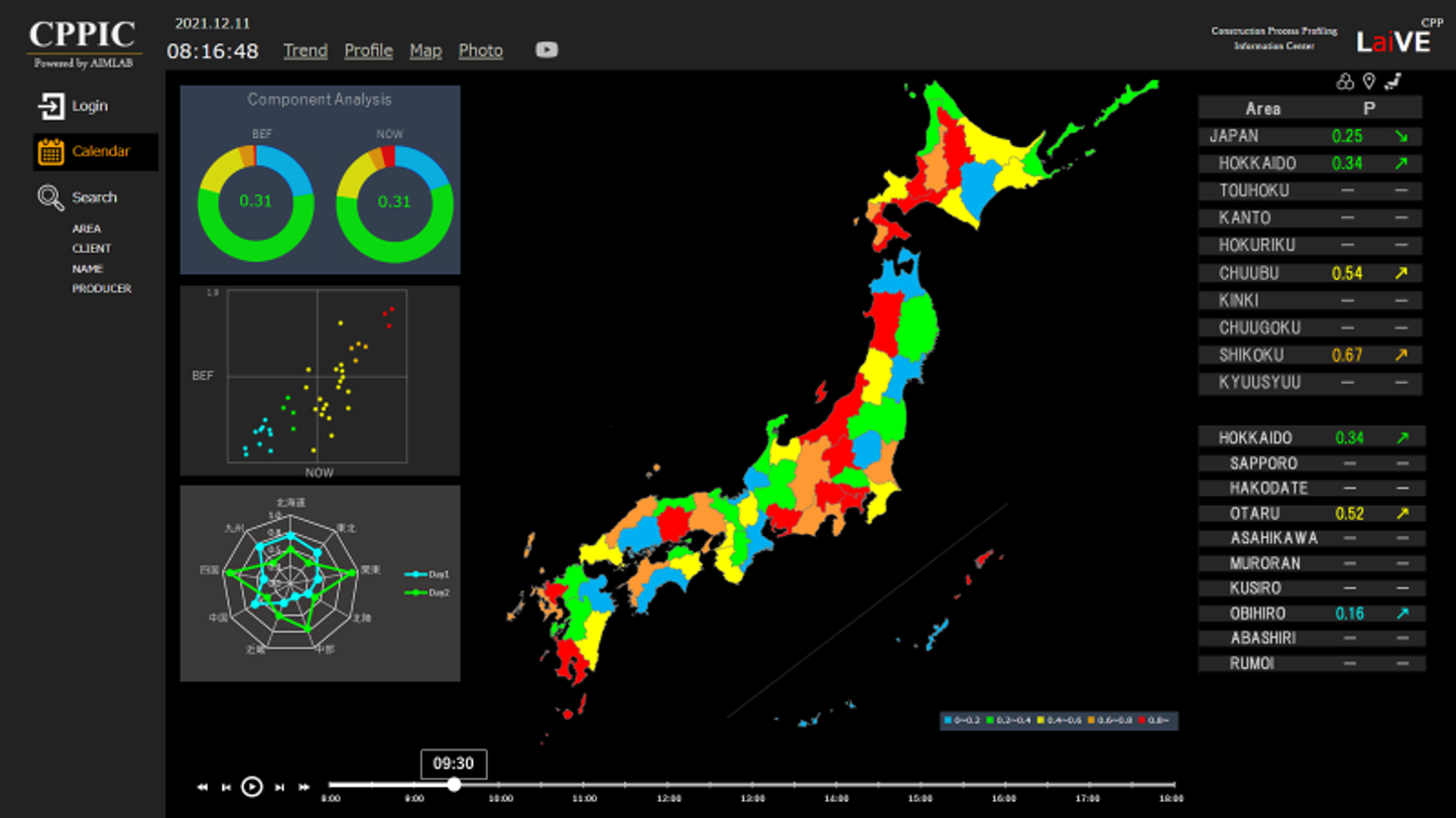 日本全土を網羅し、地方別、都道府県別に、プロファイル値をベースとした施工状況を地図上に表現します。